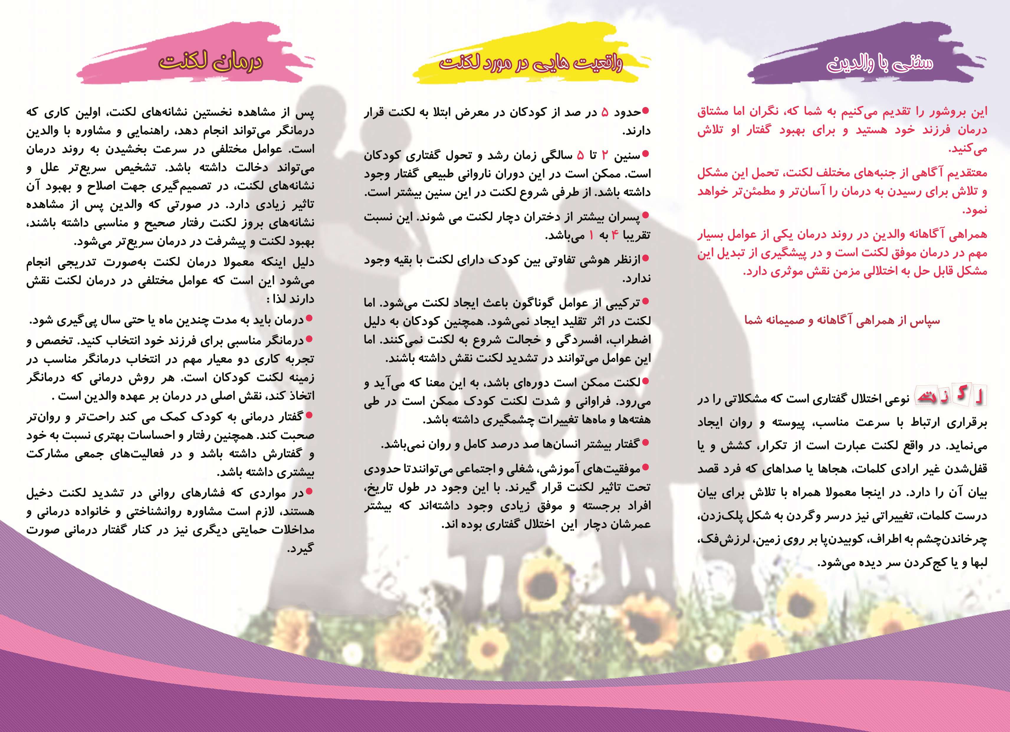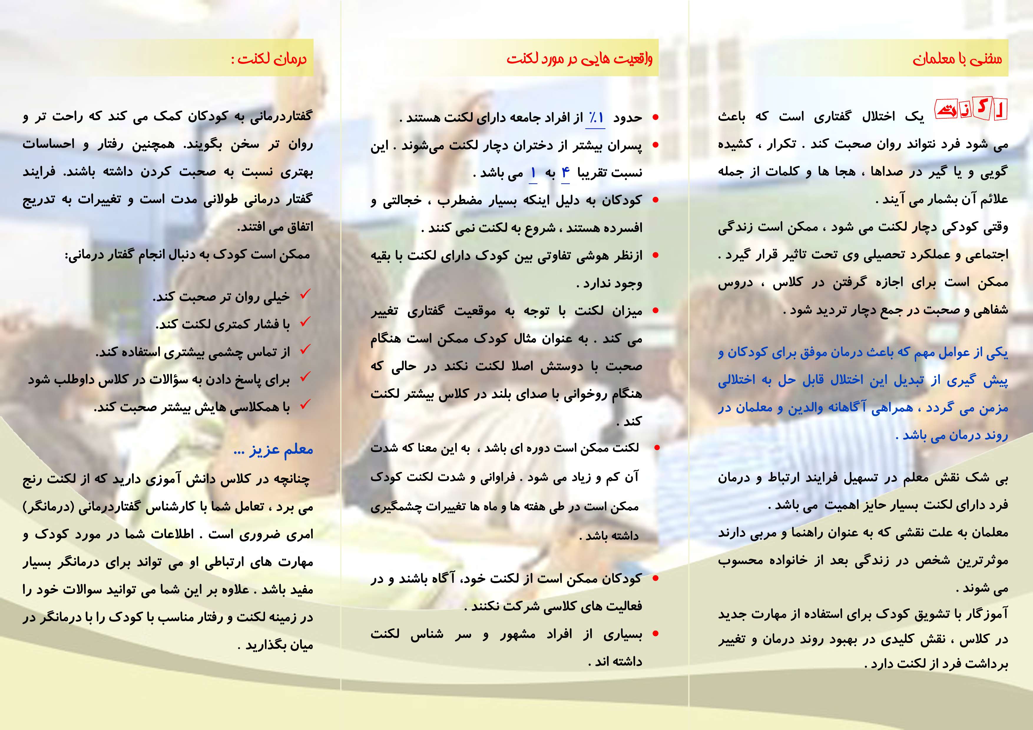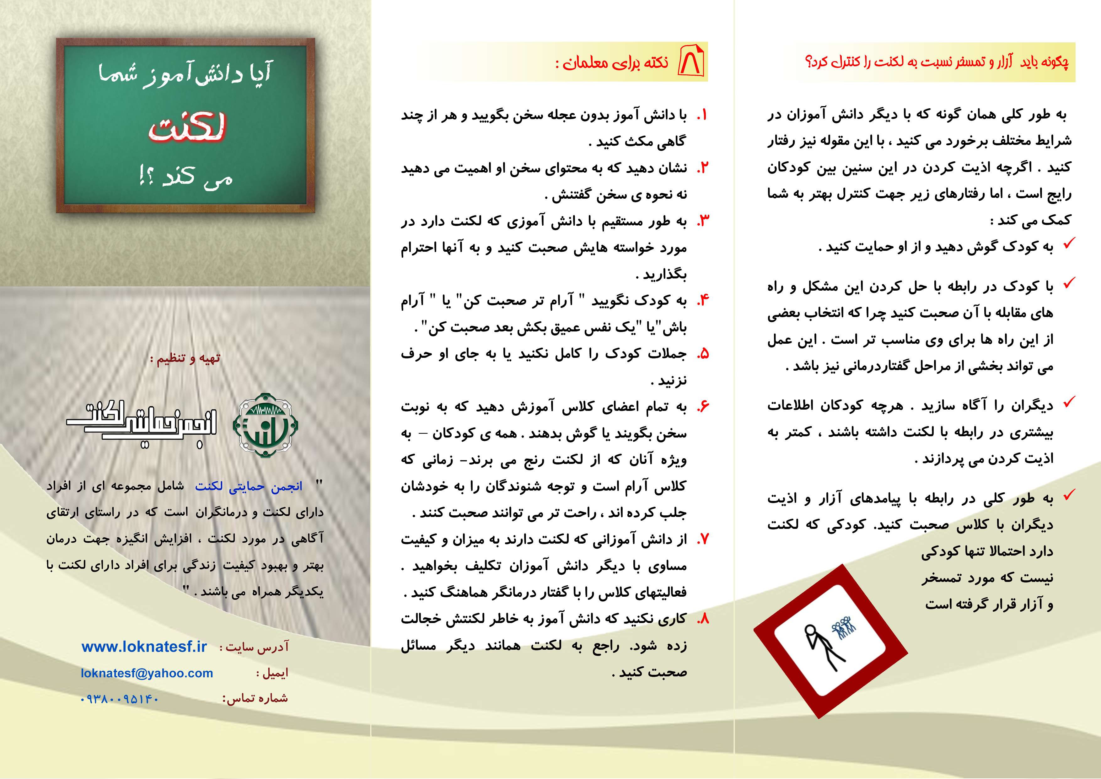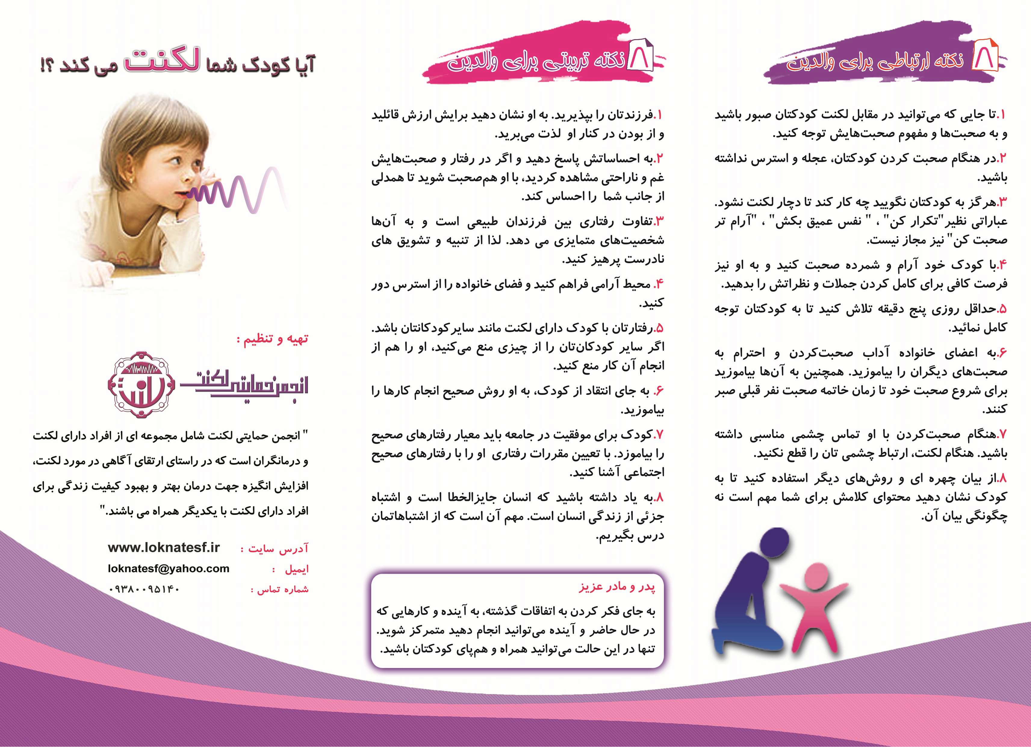 1 صحبت کردن از لکنت کودک در حضور او با دیگران و اظهار ناراحتی و نگرانی از این بابت می تواند کودک را سرخورده و گوشه گیر کند. از بروز چنین واکنش هایی پرهیزنمایید.